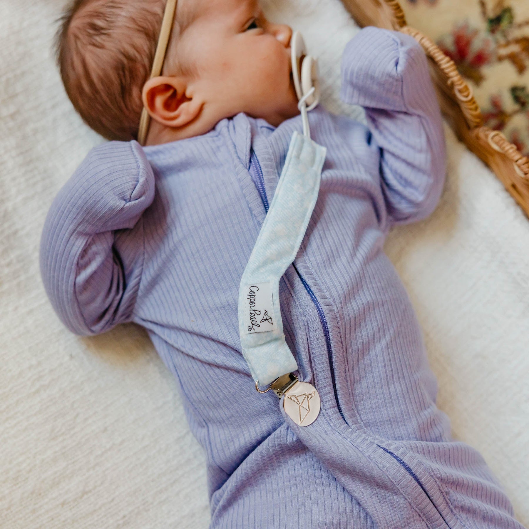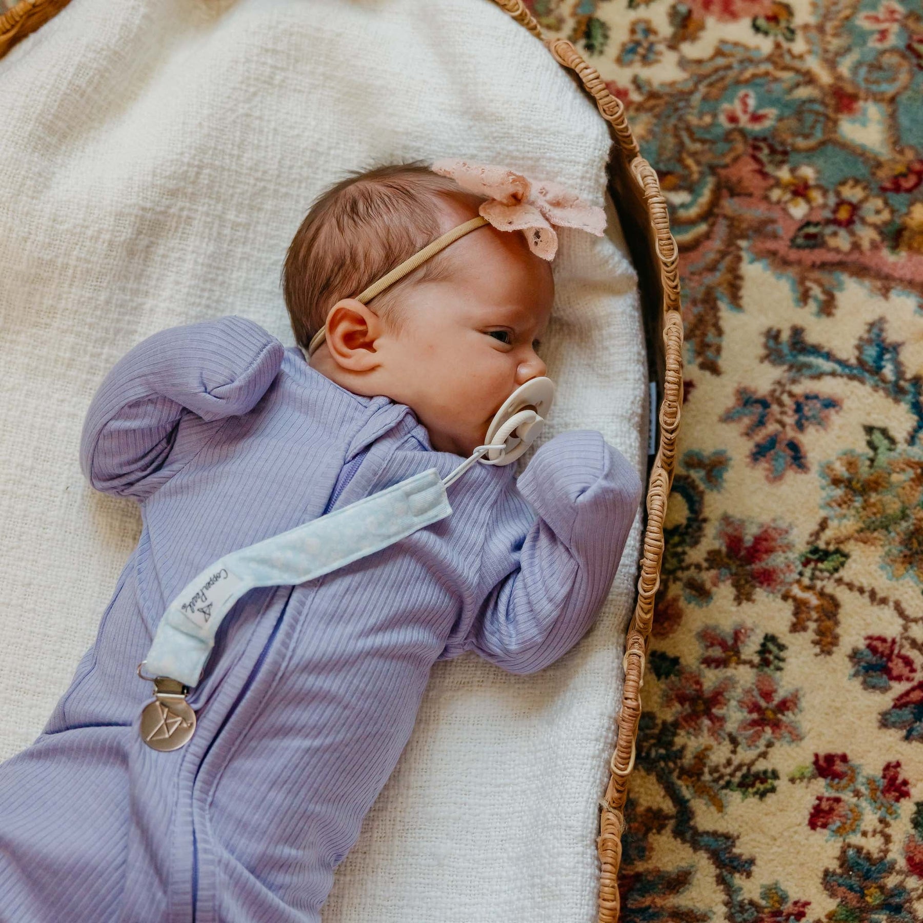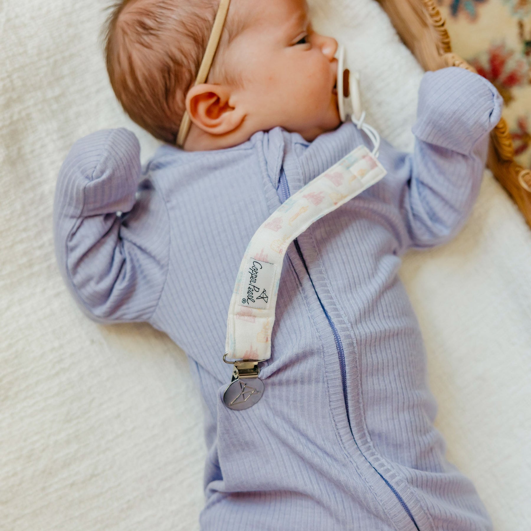 A chic way to keep baby?s pacifier close at hand. Offering the ultimate blend of fashion and function, our unique Binky Clip features a premium knit strap lined with absorbent fleece to help soak up drool. Simply attach baby?s pacifier or teether to one end, then fasten the stainless steel clip to clothing, blankets or baby gear. No more floor drops or pacifier pick-ups!