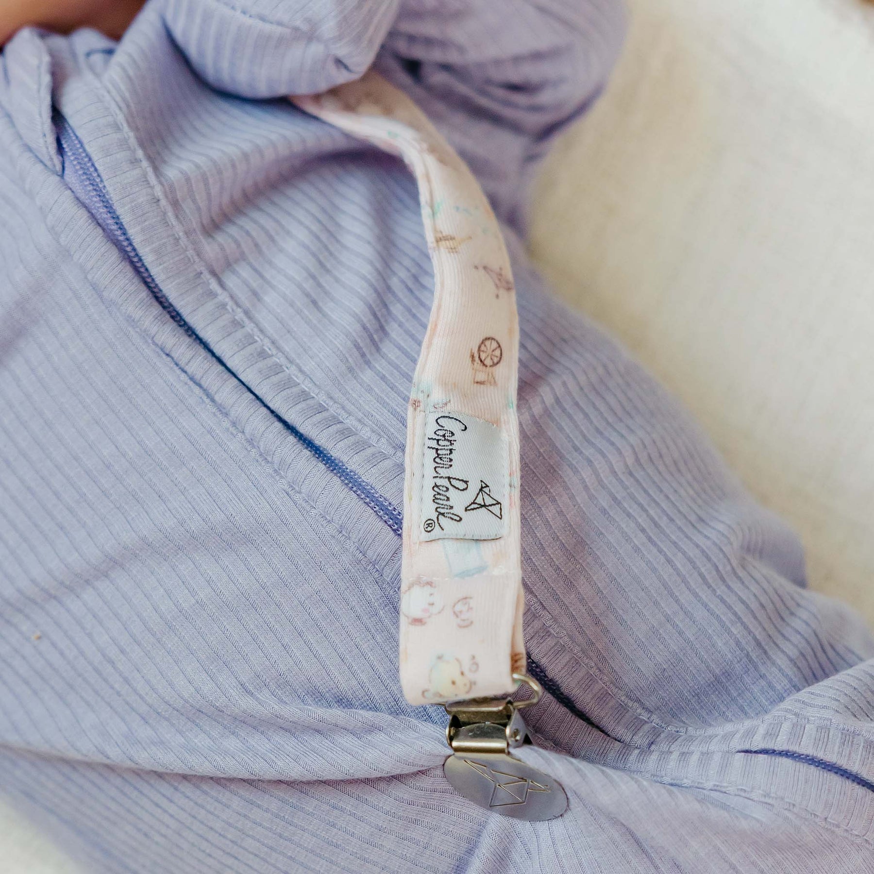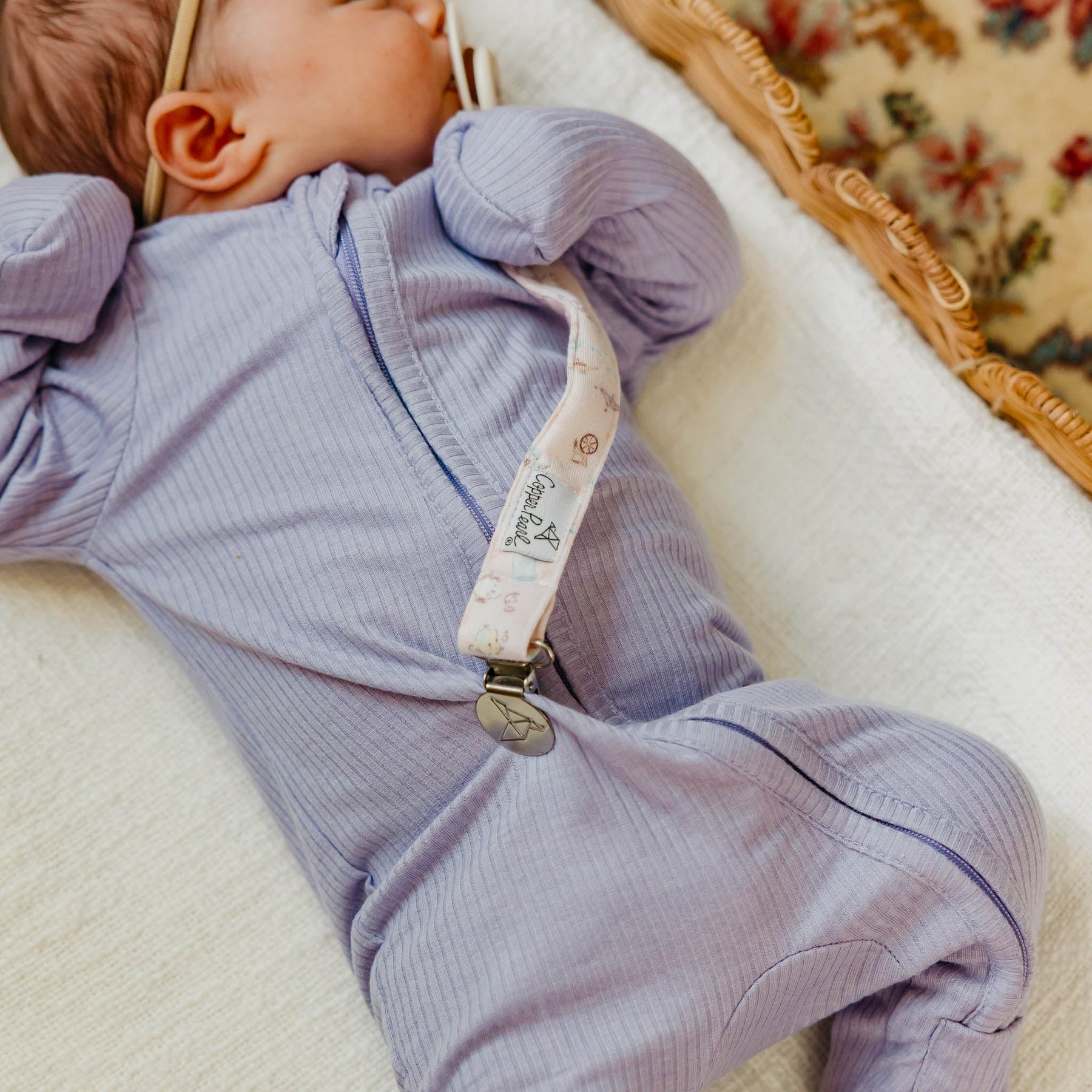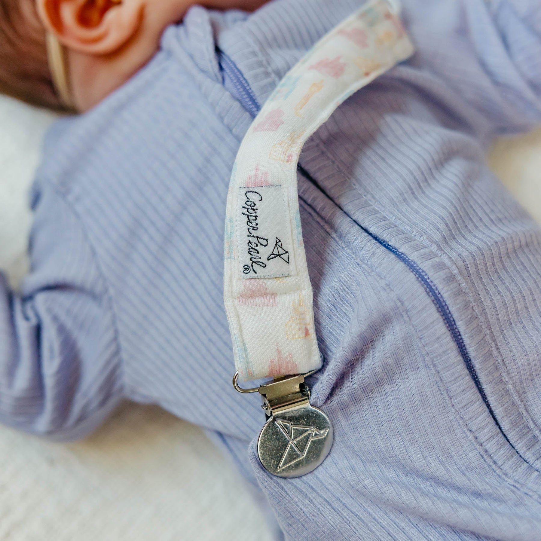 A chic way to keep baby?s pacifier close at hand. Offering the ultimate blend of fashion and function, our unique Binky Clip features a premium knit strap lined with absorbent fleece to help soak up drool. Simply attach baby?s pacifier or teether to one end, then fasten the stainless steel clip to clothing, blankets or baby gear. No more floor drops or pacifier pick-ups!