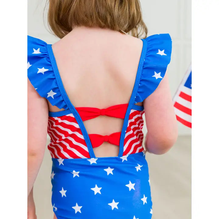 Shimmer Stars & Stripes Pinafore One Piece is the perfect choice for your little patriot's summer adventures. Featuring a vibrant red, white, and blue color scheme, this girls' one-piece swimsuit stands out with its shimmer effect and fun stripe pattern. Ideal for celebrating festive occasions or just enjoying a sunny day at the beach, this swimwear offers UPF 50+ sun protection, keeping your child safe from harmful UV rays. The 4-way stretch fabric ensures a comfortable fit that moves with her, while the material's resistance to pilling and snagging extends the life of the swimsuit. Perfect for the pool or beach, it's a stylish and practical addition to any girl's summer wardrobe.